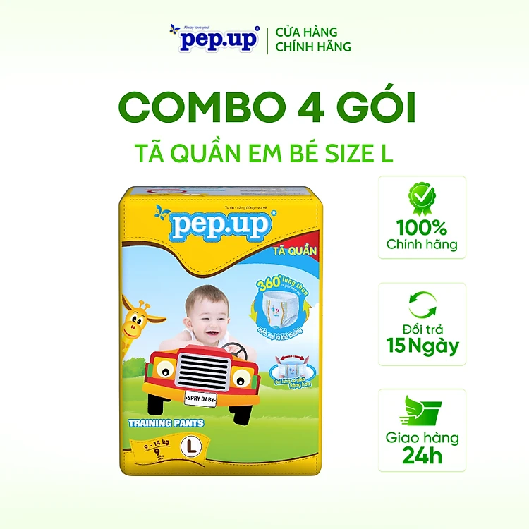 Combo 4 Gói Tã/Bỉm Quần Em Bé Pep.up Extra Dry Siêu Mềm Mại, Siêu Khô Thoáng, Kháng Khuẩn Size L (9 Miếng/Gói)