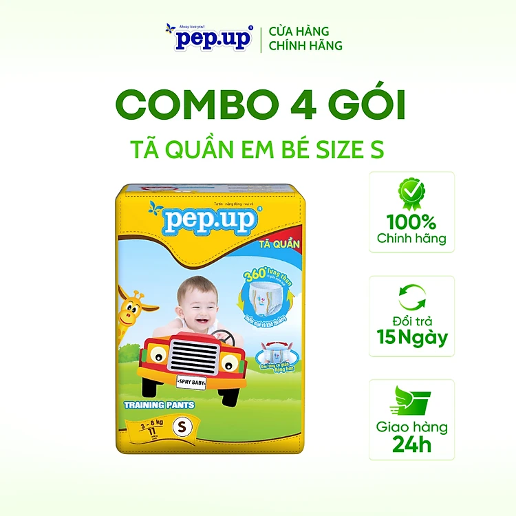 Combo 4 Gói Tã/Bỉm Quần Em Bé Pep.up Extra Dry Siêu Mềm Mại, Siêu Khô Thoáng, Kháng Khuẩn Size S (11 Miếng/Gói)