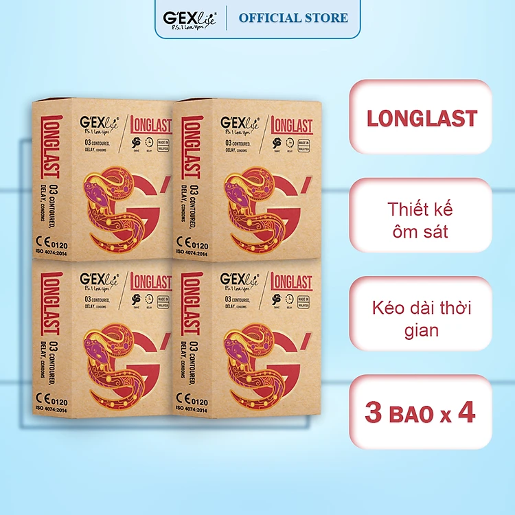 Combo 4 hộp Bao cao su GEXlife Longlast ôm khít, kéo dài thời gian (3 cái/hộp)