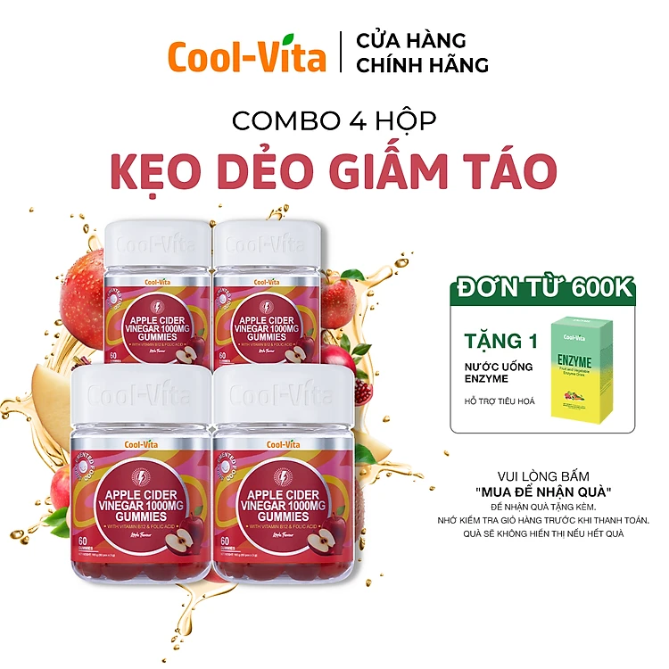 Combo 4 Hộp Kẹo Dẻo Giấm Táo Vitamin B12 Hỗ Trợ Tiêu Hóa, Tăng Cường Miễn Dịch Apple Cider Vinegar Gummy Coolvita (60 viên x 3g)/hộp