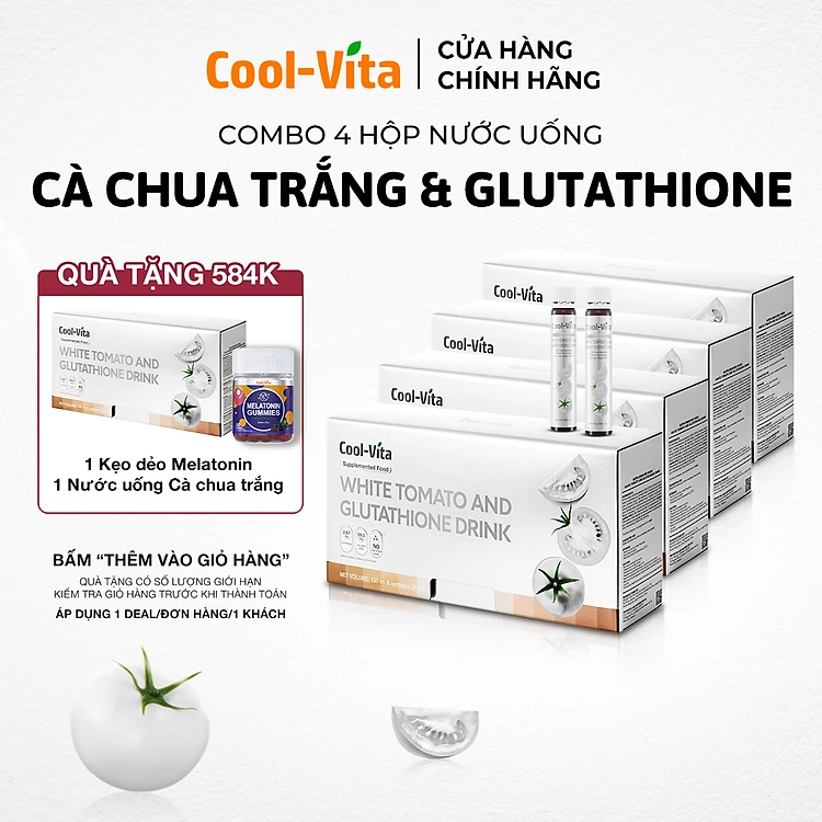Combo 4 Hộp Nước Uống Cà Chua Trắng Hỗ Trợ Sáng Da Kết Hợp Glutathione, Niacinamide, Collagen Peptide, Vitamin C Coolvita Hỗ Trợ Đều Màu Da Dưỡng Da Ẩm Mịn (6 chai × 25 ml)/hộp - Thực Phẩm Bổ Sung