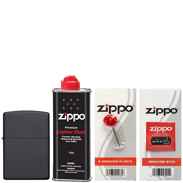Combo 4 sản phẩm : Bật lửa Zipp Black Matte 218+Xăng+Đá+Bấc