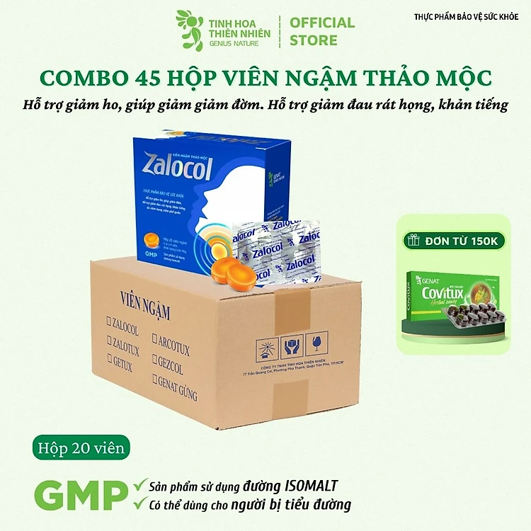 Combo 45 hộp viên ngậm ho thảo mộc Zalocol Hỗ trợ giảm đờm, giảm đau rát họng, khản tiếng do viêm họng, viêm phế quản (Hộp 20 viên) - Genat