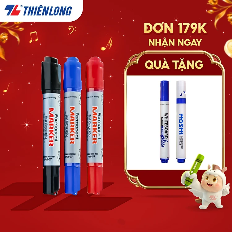 Combo 5/10/20 Bút lông dầu Thiên Long PM-07 2 đầu bút kích thước 0.8 mm và 6mm, 3 màu mực xanh/đỏ/đen, bám dính tốt trên nhiều bề mặt