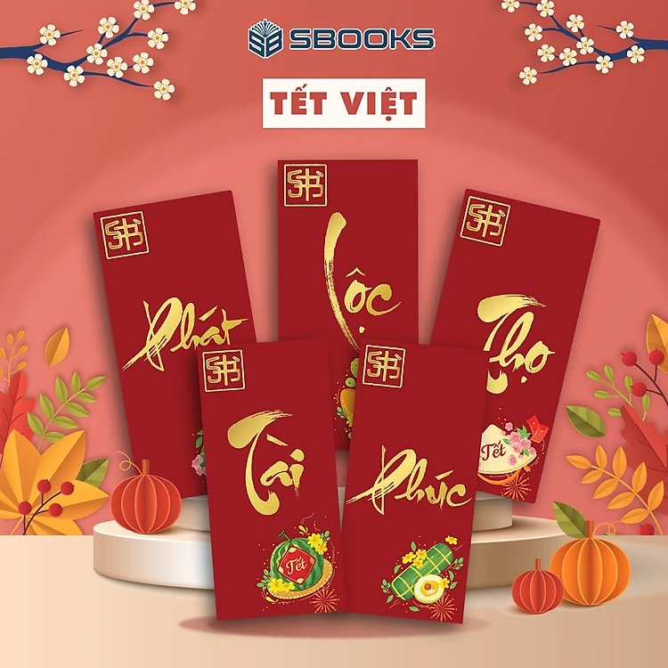Combo 5 Cái Bao Lì Xì Thiết Kế Chữ Phúc, Tài, Phát, Lộc, Thọ - Tết Việt 2025 Giấy Cứng C150 Siêu Dày Dặn - SBOOKS
