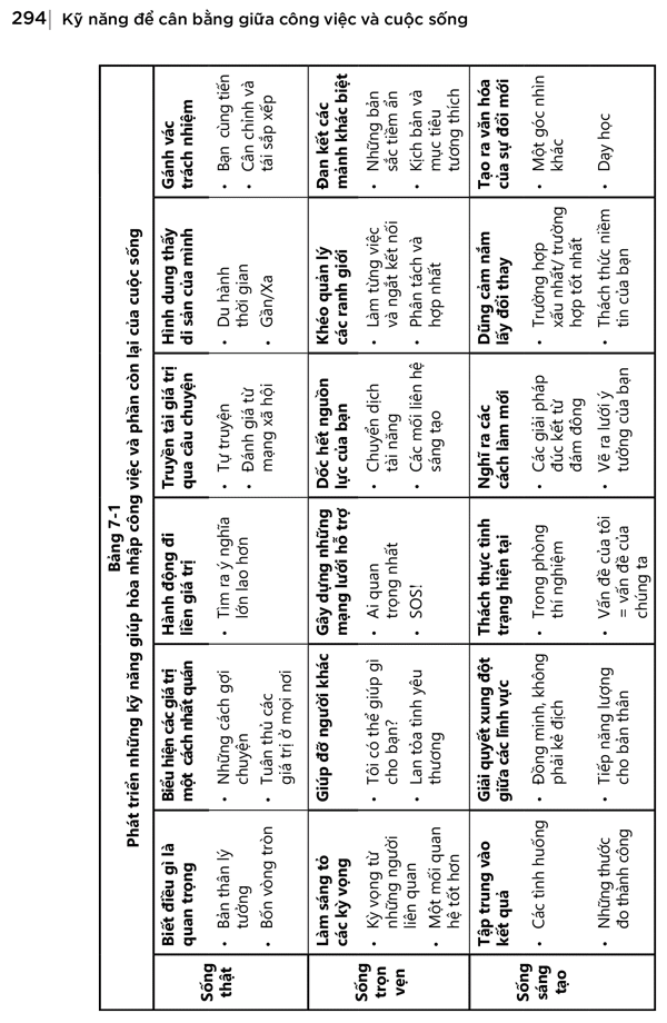 Kỹ năng để cân bằng giữa công việc và cuộc sống đem đến một lối tư duy mới mẻ cũng như các cách thực hành mới mà hiện nay bạn có thể áp dụng. Mục đích của nó là trợ giúp bạn phát triển những kỹ năng cần thiết để có một cuộc sống theo bạn định nghĩa là thành công. Ở Phần I, bạn sẽ xem xét cách mỗi người trong sáu hình mẫu tìm ra hướng đi của riêng mình để theo đuổi chiến thắng bốn chiều – để hòa hợp những khía cạnh khác nhau theo những cách đem lại lợi ích chung – trong suốt cuộc đời họ. Bạn sẽ hiểu họ đã học tập, rèn luyện và áp dụng – chủ đích hoặc bằng trực giác – những kỹ năng riêng biệt như thế nào để đạt đến sự hài hòa trong cuộc sống phức tạp của mình. Thậm chí, dẫu cuộc đời của mỗi người không giống của bạn, bạn vẫn sẽ tìm ra cách áp dụng những bài học đó vào tình huống của mình. Những ví dụ này sẽ giúp bạn thu được dũng khí để khơi dậy sự đổi thay lớn, bởi làm vậy là tốt cho bạn cũng như mọi người xung quanh. Bạn có thể chọn lấy những câu chuyện mà mình quan tâm nhất và bạn có thể đọc chúng tùy theo thứ tự mình cảm thấy hợp lý. Những kỹ năng bạn được chia sẻ và hướng dẫn cụ thể bao gồm: