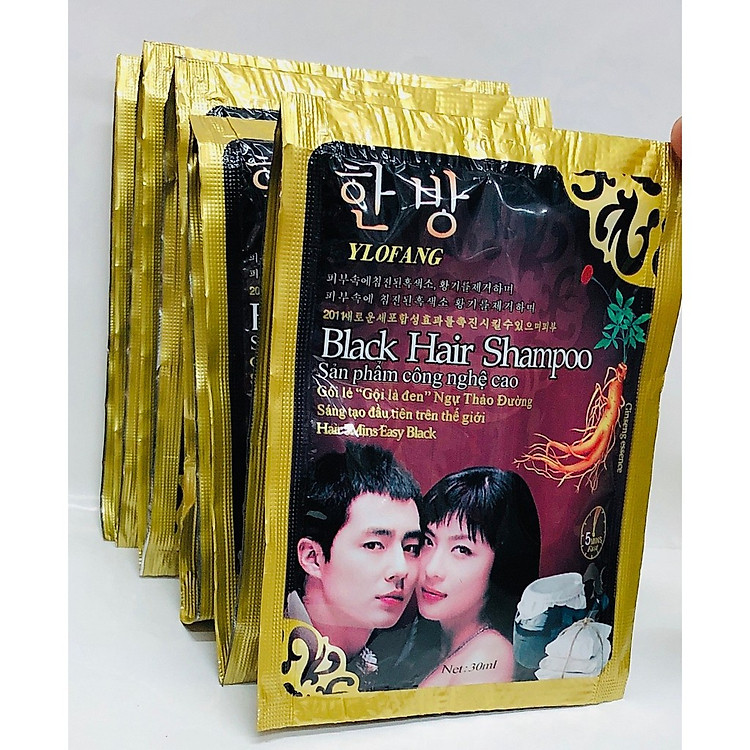 Cách sử dụng: 1. Làm ướt hết tóc, rồi lau sơ lại (không lau quá khô) 2. Dùng kéo cắt phần miệng 2 gói nhuộm tóc. Cho dầu gội nhuộm đổ vào cái chén hoặc vào lòng bàn tay của bạn, trộn đều hỗn hợp dầu gội rồi cho lên tóc bắt đầu gội và massage da đầu, từ chân tóc đến ngọn tóc (tạo bọt, bọt càng nhiều hiệu quả càng cao, nếu thấy tóc hơi bị khô thì có thể thêm một ít nước cho lên tóc để vò đầu tóc cho đều và thật kĩ). Sau đó bọt trắng sẽ chuyển dần thành màu đen. Thời gian để cho dầu gội có tác dụng với tóc như sau: - Tóc hoa râm: từ 8 - 12phút - Tóc bạc trắng: từ 15 - 20phút - Tóc dài nhiều, hoặc đang sử dụng thuốc nhuộm: từ 20 - 25phút 3. Sau khi để thời gian cho dầu gội có tác dụng với tóc như miêu tả ở trên rồi bạn hãy xả dầu gội cho thật sạch bằng nước lạnh và lau khô đầu tóc.