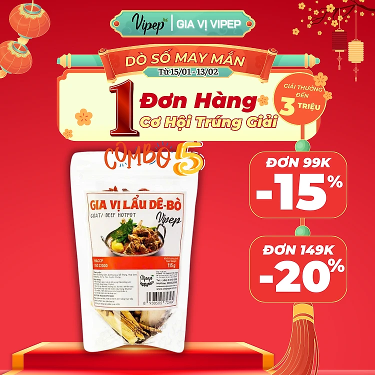 Combo 5 gói gia vị nấu lẩu bò, dê Vipep 115g - gia vị ninh hầm quý hiếm (kỷ tử, đại táo, hạt sen, hoài sơn, đảng sâm..)