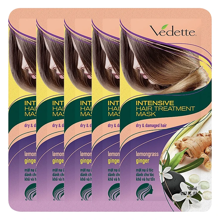 - Combo 5 Mặt Nạ Ủ Tóc Vedette Lemongrass (20ml / Miếng) với tinh chất gừng và sả bổ sung dưỡng chất Vitamin C, cân bằng độ ẩm cho tóc, giúp tóc mềm mượt hơn và không còn tình trạng rối xù, gãy rụng nữa.