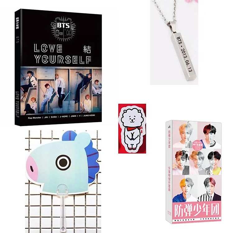 Combo 5 món đồ BTS gồm quạt cầm tay tẩy BTS chibi postcard dây chuyền photobook