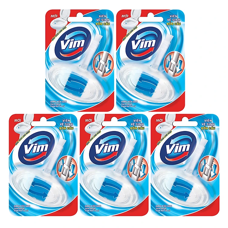 - Combo 5 Viên Treo Bồn Cầu Vim (40g / Viên) - Viên vệ sinh bồn cầu Vim hương biển xanh 40g - 3 trong 1 độc đáo với cấu trúc 3 lớp đặc biệt kết hợp 3 tác động: ngăn ngừa sự phát triển của vi khuẩn, ngăn chặn sự hình thành của mảng bám kém vệ sinh, mang lại sự thơm mát nhờ tác động của lớp gel năng động.
