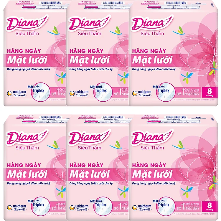 Combo 6 Băng Vệ Sinh Hàng Ngày Diana Daily Hương Hoa Mặt Lưới (Gói 8 Miếng)