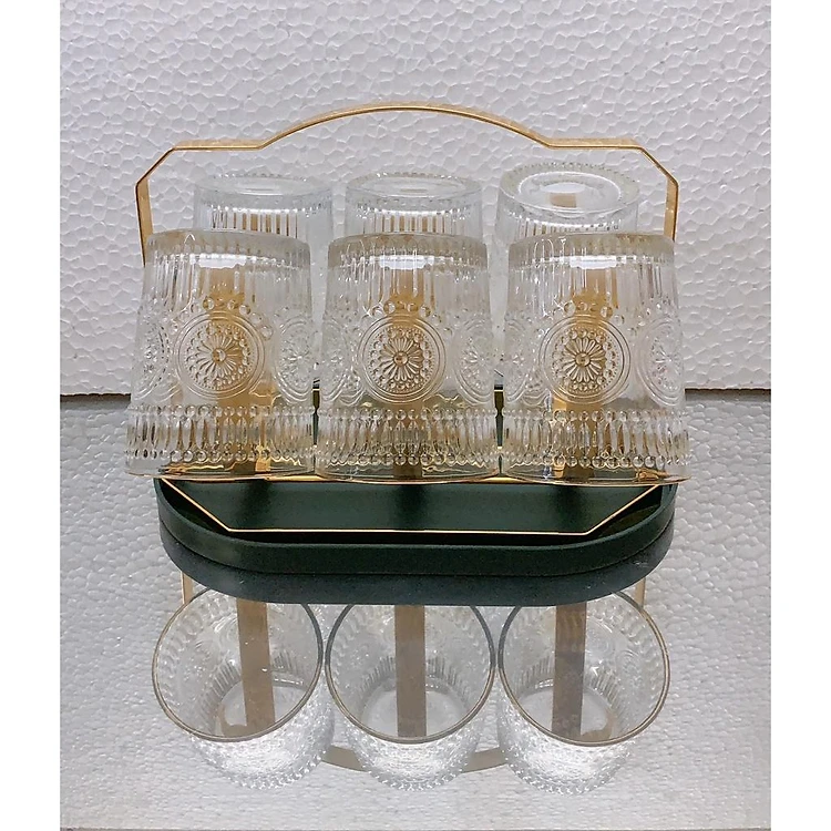Combo 6 cốc thủy tinh uống nước chịu nhiệt cao cấp họa tiết tống đồng kèm giá úp cốc có khay hứng nước ngọng vàng