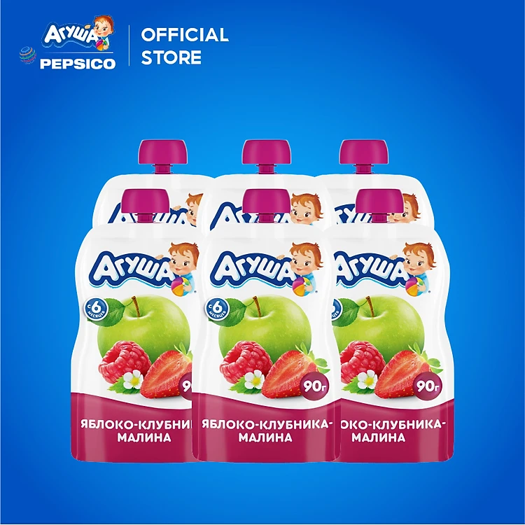 Combo 6 Gói Trái cây nghiền vị táo, dâu tây và mâm xôi Agusha 90g/gói dành cho bé từ 6 tháng trở lên