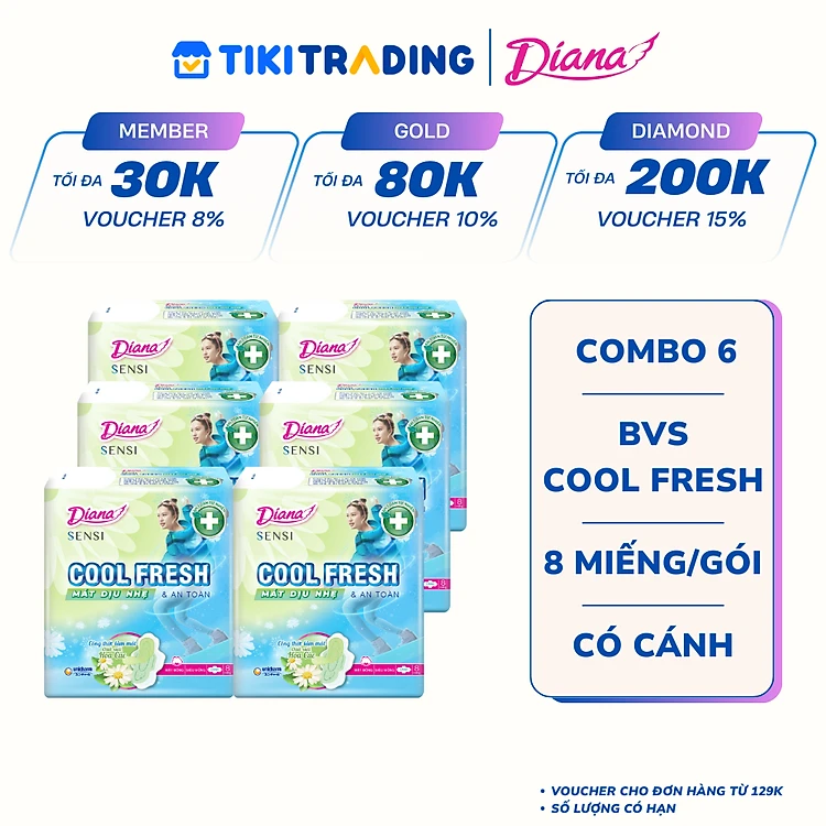 Combo 6 gói băng Vệ Sinh Diana Sensi Cool Fresh Mát Dịu Siêu Mỏng Cánh 8 miếng