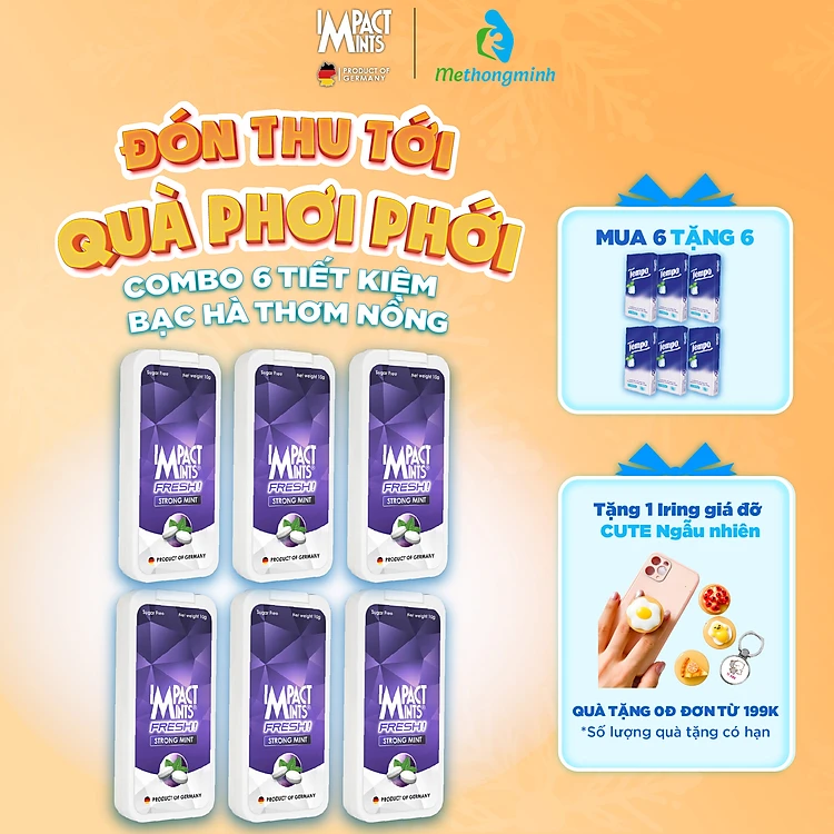 Combo 6 Kẹo Không Đường Bạc Hà IMPACT MINTS FRESH 10g (Tặng kèm 6 gói khăn giấy tempo)
