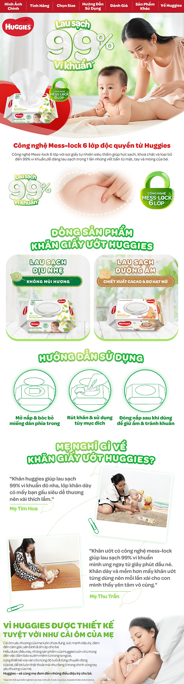 - Khăn giấy ướt em bé Huggies nhờ công nghệ Mess-lock 6 lớp với sợi giấy tự nhiên siêu thấm giúp hút sạch, khoá chặt và loại bỏ đến 99% vi khuẩn. Sản phẩm dễ dàng lau sạch trong 1 lần những vết bẩn từ mặt, tay và mông của bé.