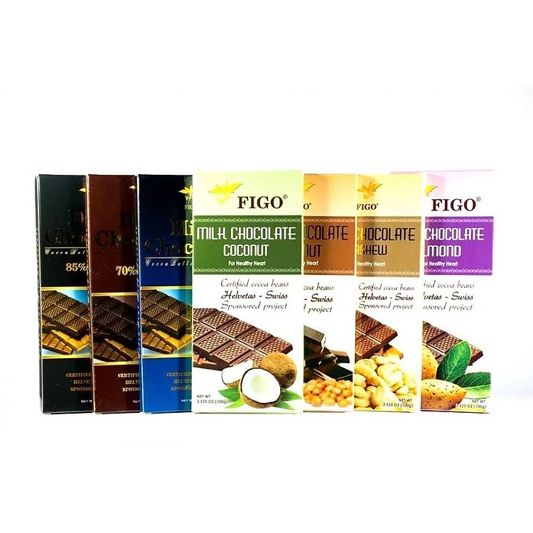 Chocolate Figo cho ra đời dòng Sản Phẩm Combo 7 thanh Chocolate Figo gồm Chocolate đen đắng 100% cacao, 85% cacao, 70% cacao, socola sữa nhân hạt điều, hạnh nhân, chocolate dừa, chocolate hạt cacao nibs, chocolate đậu phộng, chocolate sữa, thơm ngon, bổ dưỡng, được chế biến theo qui trình an toàn VSTP và khép kín từ Công ty Khang Pham Food.
