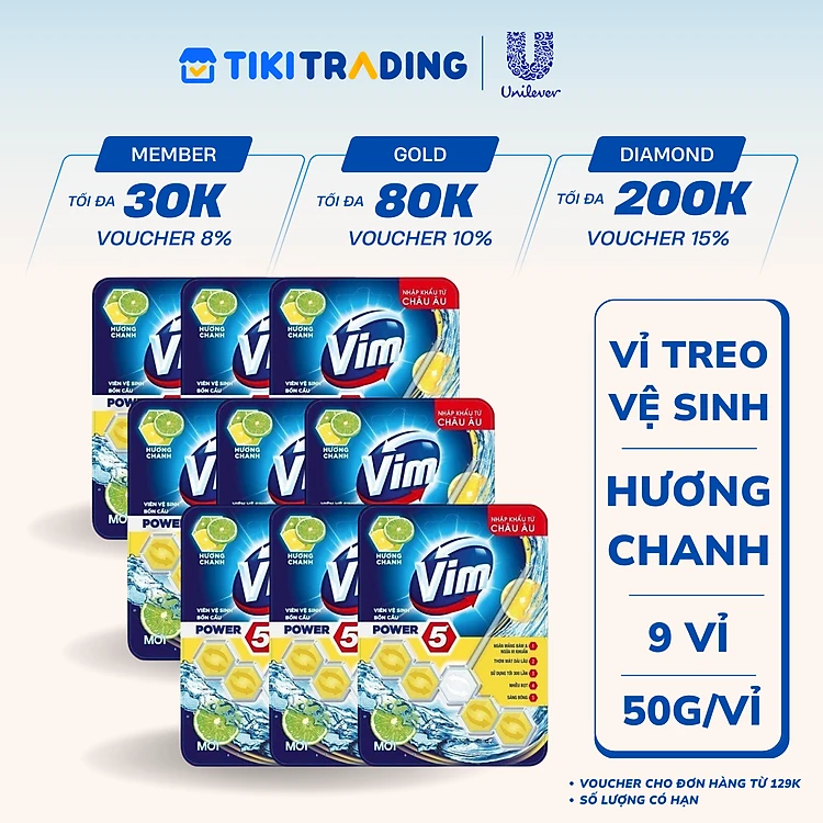 Combo 9 Vỉ Treo Tẩy Bồn Cầu Vim Power 5 Hương Chanh Sạch Khuẩn Thơm Mát 50G/Viên