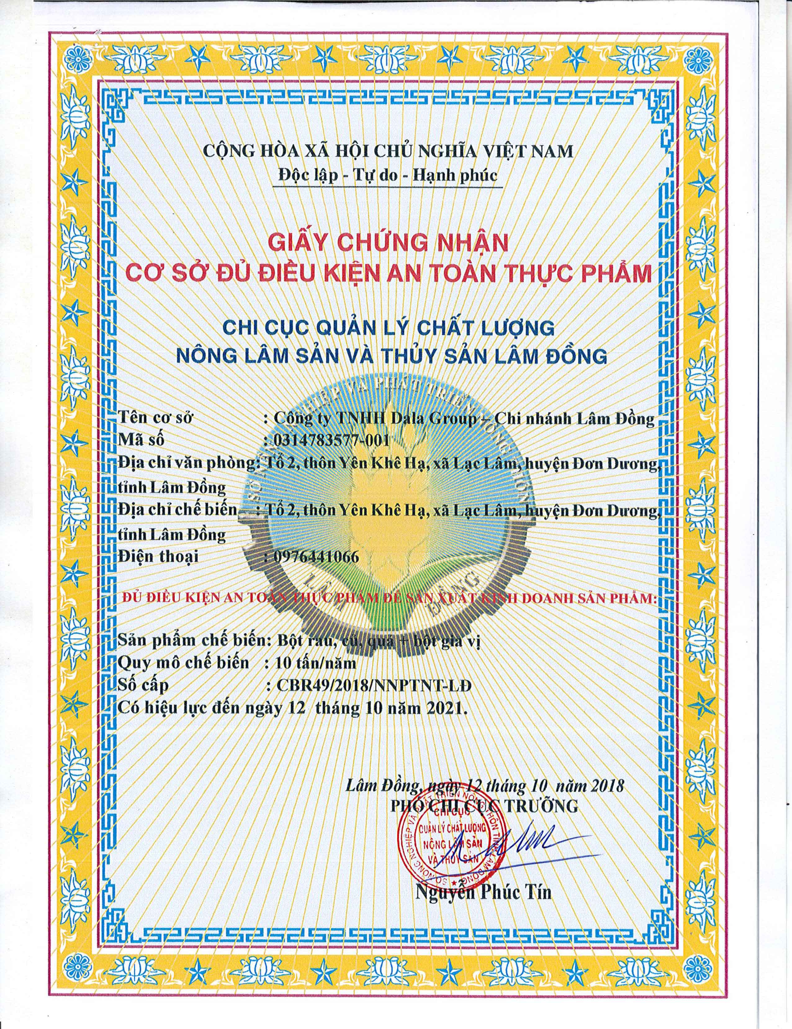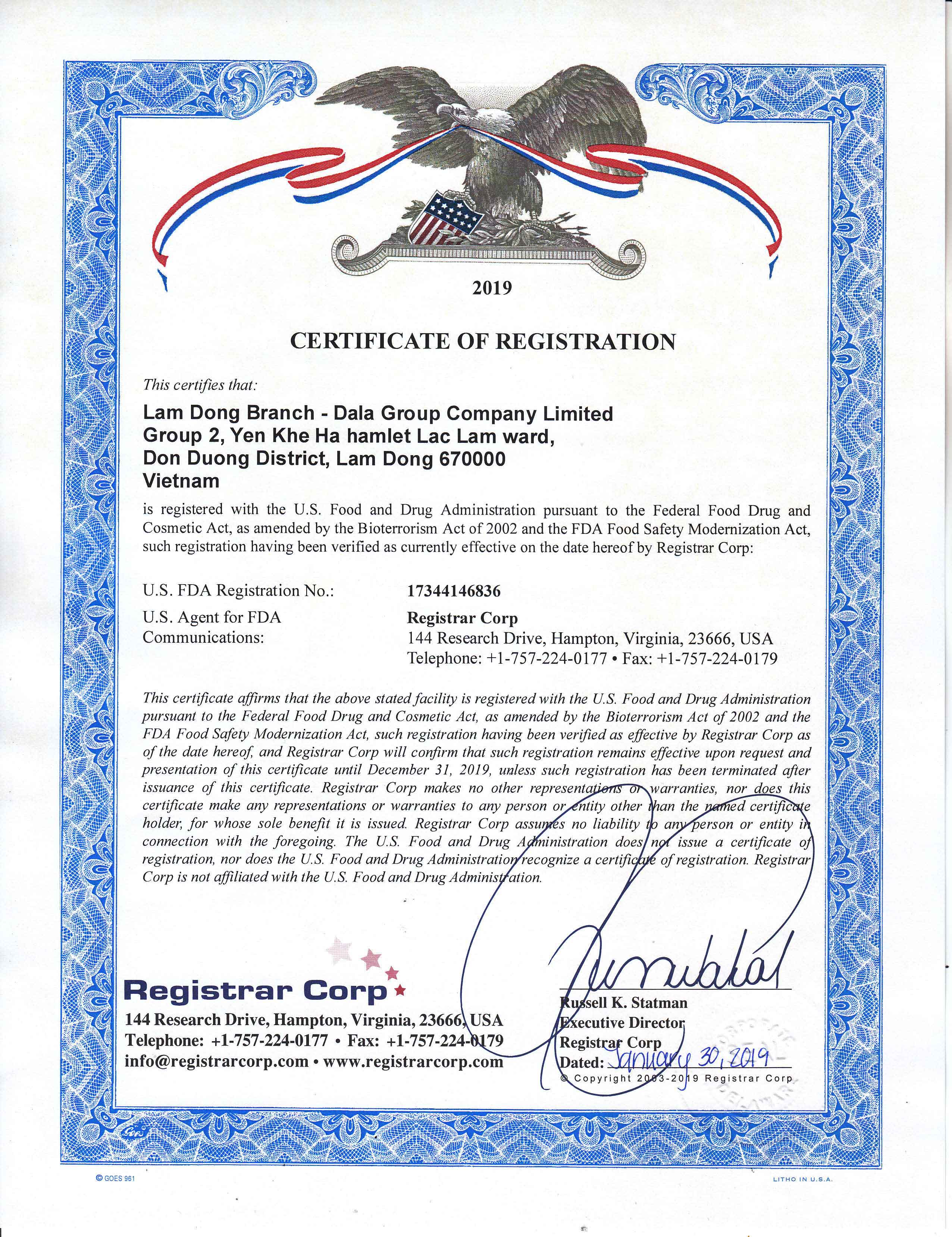 + Giấy Chứng nhận thực phẩm FDA của Bộ Nông Nghiệp Hoa Kỳ