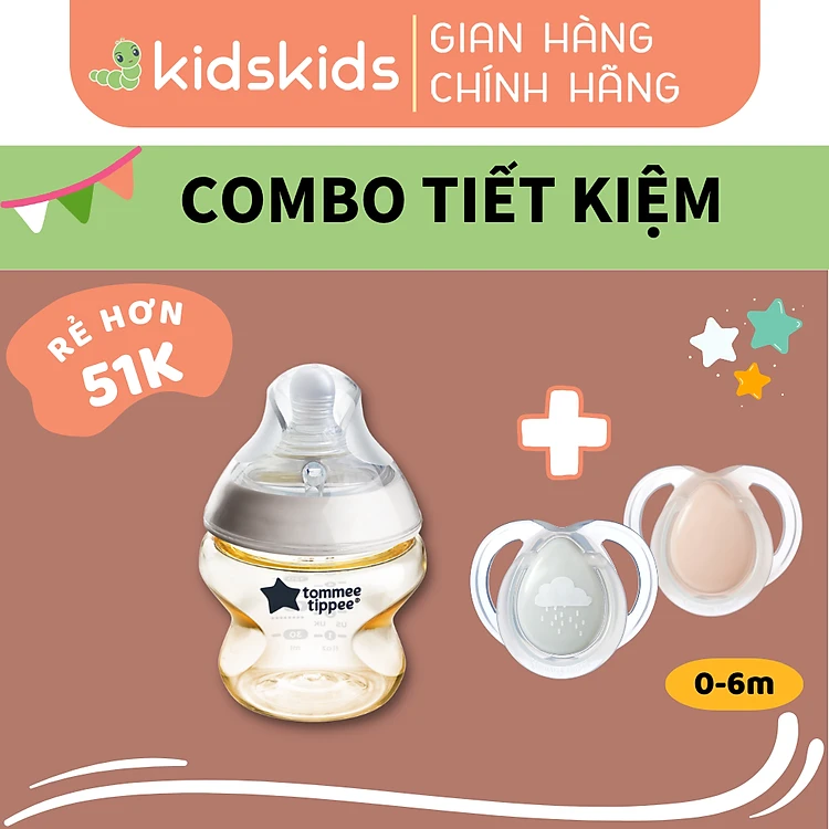 COMBO Ty Ngậm Dạ Quang Cho Bé Tommee Tippee Night Time 0-6m & Bình Sữa PPSU Ty Siêu Mềm Tự Nhiên 150ml