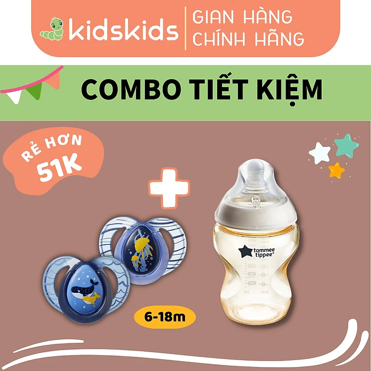 COMBO Ty Ngậm Dạ Quang Cho Bé Tommee Tippee Night Time 6-18m & Bình Sữa PPSU Ty Siêu Mềm Tự Nhiên Tommee Tippee 260ml