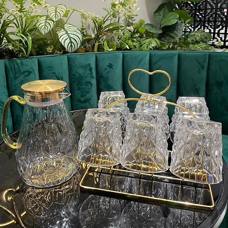 Combo bình thủy tinh đựng nước uống kèm 6 cốc và giá úp