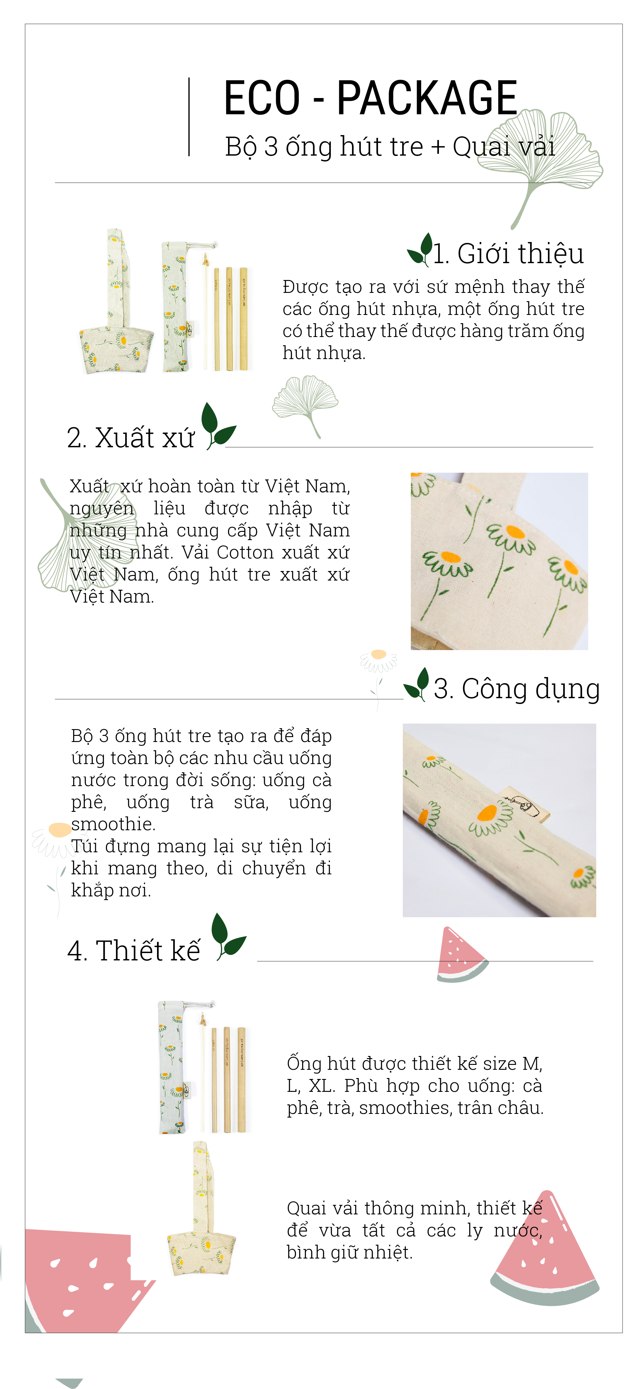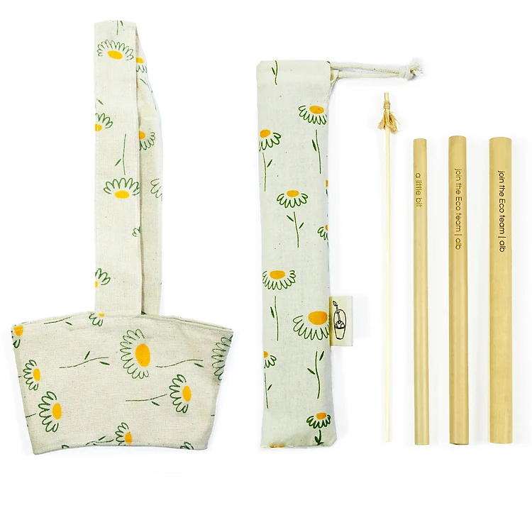 Combo Bộ 3 Ống hút tre, Túi Đựng, Cọ Rửa và Quai Vải Đựng Ly Hoa Cúc