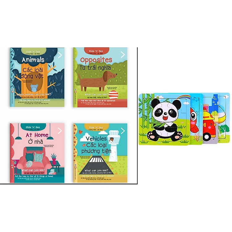 Combo: (Bộ 4 Cuốn): Cùng Kéo Và Nhìn (Sách Song Ngữ Có Tương Tác): Ở Nhà + Các Phương Tiện + Từ Trái Nghĩa + Các Loại Động Vật. Tặng tranh ghép hình cho bé