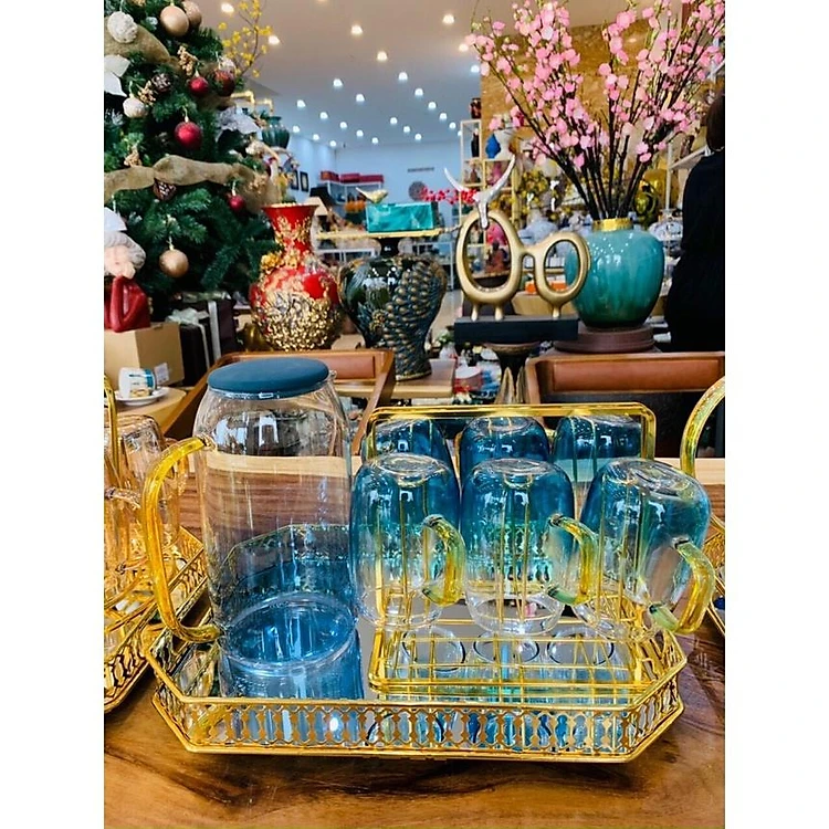 Combo bộ bình đựng nước thủy tinh cao cấp 6 cốc kèm khay và giá úp mạ vàng
