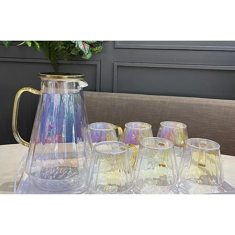 COMBO BỘ BÌNH ĐỰNG NƯỚC UỐNG THỦY TINH CHỊU NHIỆT CAO CẤP MÀU TRẮNG ÁNH TRAI KÈM 6 CỐC, KHAY GIÁ ÚP