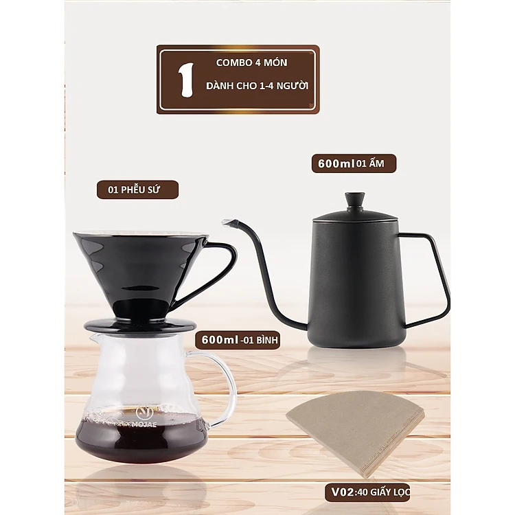 COMBO BỘ SẢN PHẨM PHA CÀ PHÊ DRIP V60 GỒM 4 MÓN ( BÌNH RÓT INOX - PHỄU SỨ - BÌNH ĐỰNG THUỶ TINH - GIẤY LỌC 40 TỜ