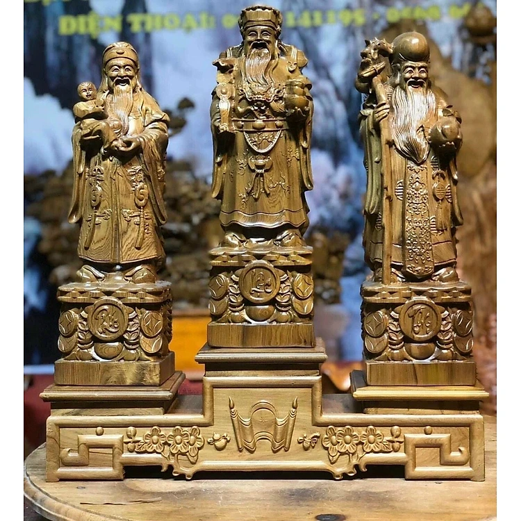 Combo bộ tam đa phúc lộc thọ bằng gỗ bách xanh thơm nức kt cao 30×11×9cm +thêm chân đế tam cấp đủ bộ cao tổng 42 cm