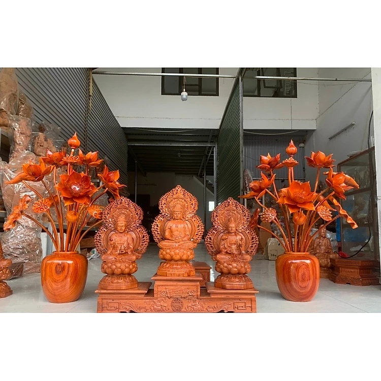 Combo bộ tượng phật tam thánh và kệ chân đế bằng gỗ hương đá + với 2 bình hoa sen 17 cành ,hoa ,lá gương