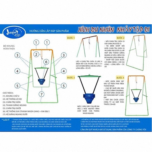 - Hệ khung giá đỡ xích đu: Khung giá đỡ được làm bằng thép cao cấp, phi 19, mạ kẽm, lớp sơn tĩnh điện ngoài cùng. Thiết theo dạng chữ U và ghép lại với nhau tạo tư thế 4 chân rất vững chắc. Đặc biệt có thêm khung giằng dưới càng chắc chắn hơn. Bộ khung đã được thử nghiệm với trọng lượng 100kg của người lớn. Công ty cam kết thiết kế khung giá đỡ hoàn toàn đảm bảo an toàn để các bé chơi và nhún thoải mái .