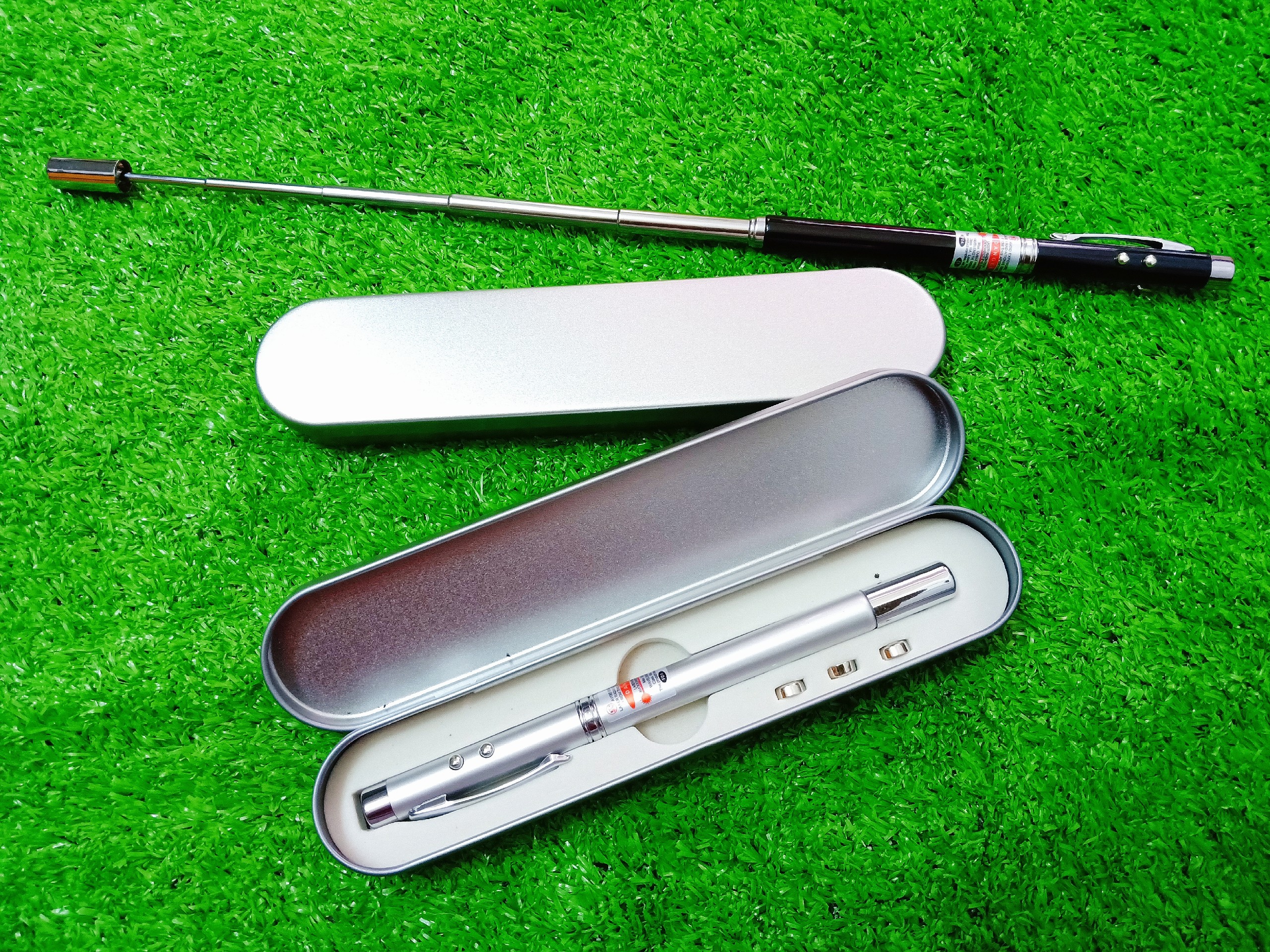 Bút có 2 đèn bấm (đèn trắng cho ánh sáng lan rộng, đèn đỏ cho ánh sáng tập trung tại 1 điểm). Đèn đỏ chiếu xa đến 10m.