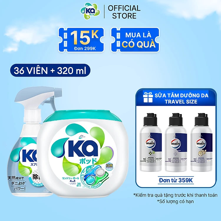 Combo Chăm sóc quần áo KA: 1 Hộp 36 viên giặt quần áo 4in1+ 1 Xịt thơm vải chống mạt bụi 320ml