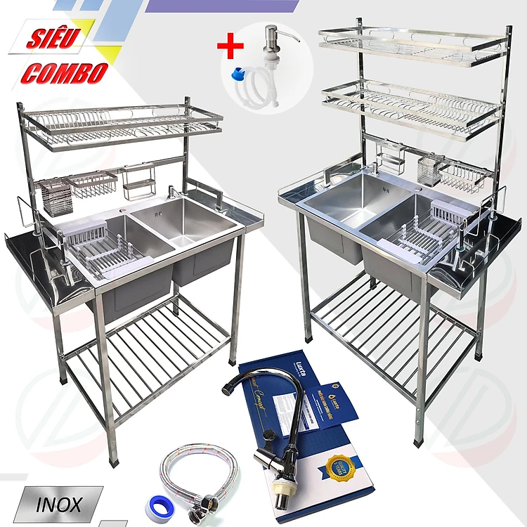 COMBO Chậu Inox 2 Hộc Có Chân Kèm Kệ Úp Chén Đa Năng - Gồm chậu 2 hộc, chân, kệ chén 1 tầng hoặc 2 tầng, vòi Luxta lạnh, tặng rổ rút, dây cấp, keo lụa