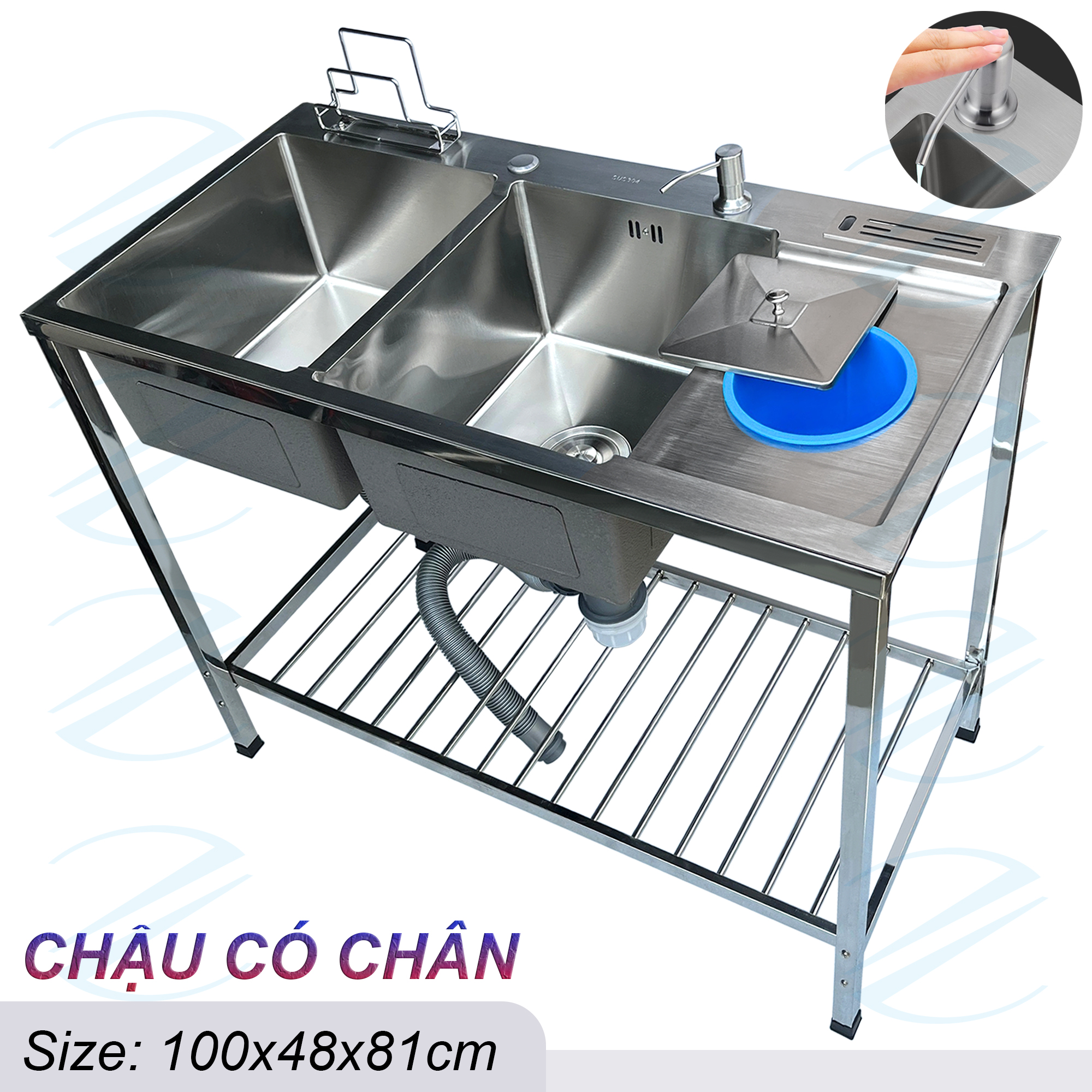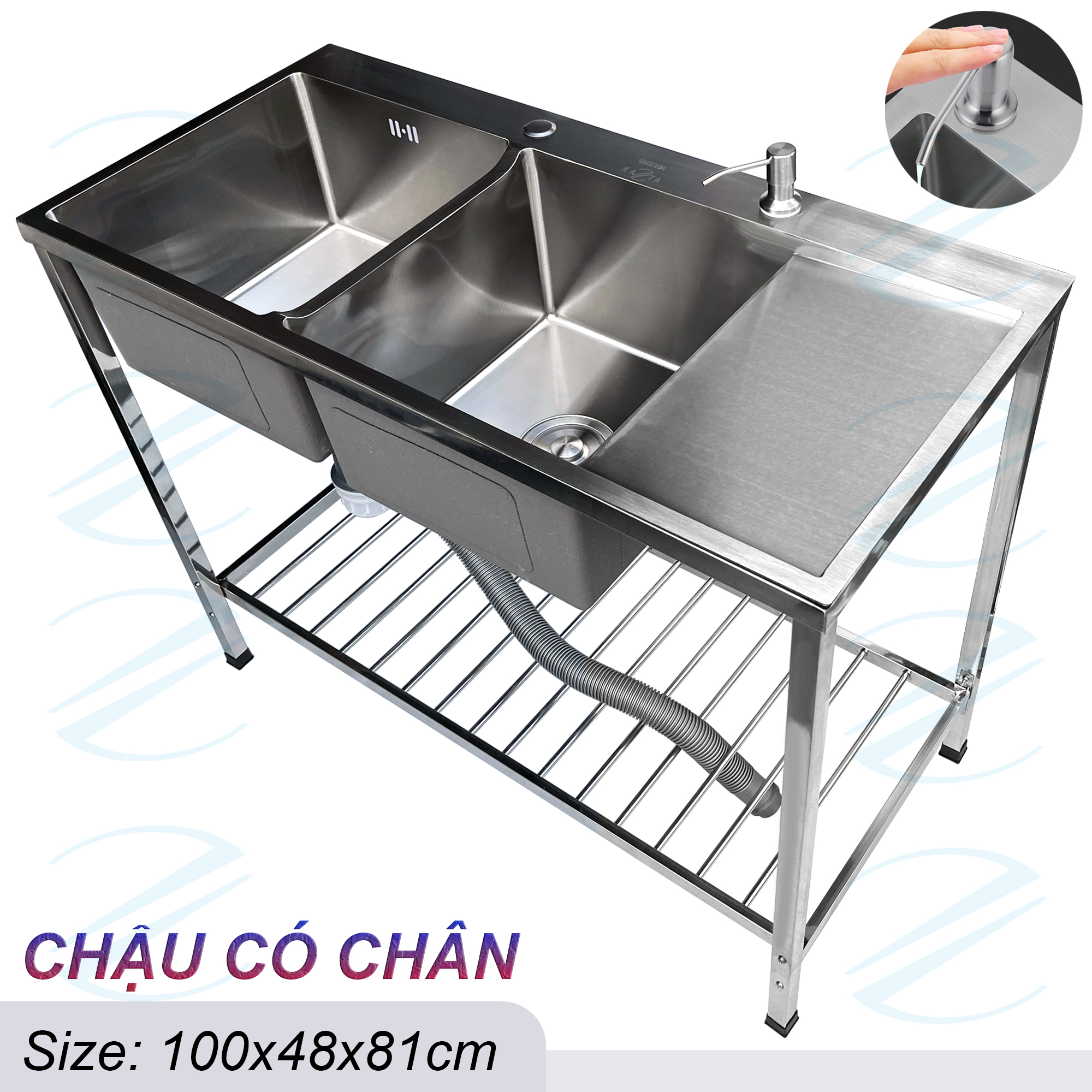 COMBO Chậu Rửa Bát Inox Có Chân 100x48x81cm Kiểu 2 Hộc 1 Cánh Tiện Nghi Rộng Rãi - Đủ bộ gồm chậu, xi phông, chân và vòi rửa, tặng vòi hút xà bông