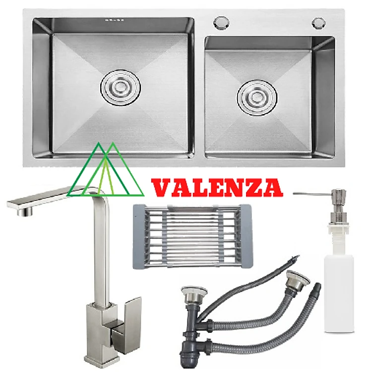 Combo chậu rửa bát inox sus304 8245 hố lệch + vòi rửa bát inox nóng lạnh Vuông+ bình xà phòng + rá inox đa năng + bộ xả chậu