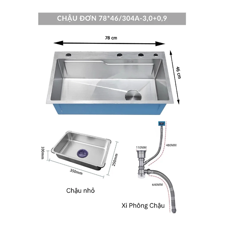 Combo chậu rửa chén 1 hố 7846 sus304 Valenza vòi rửa bát nóng lạnh dây rút 02 bộ xả khay inox bình rửa bát- Dày 3li