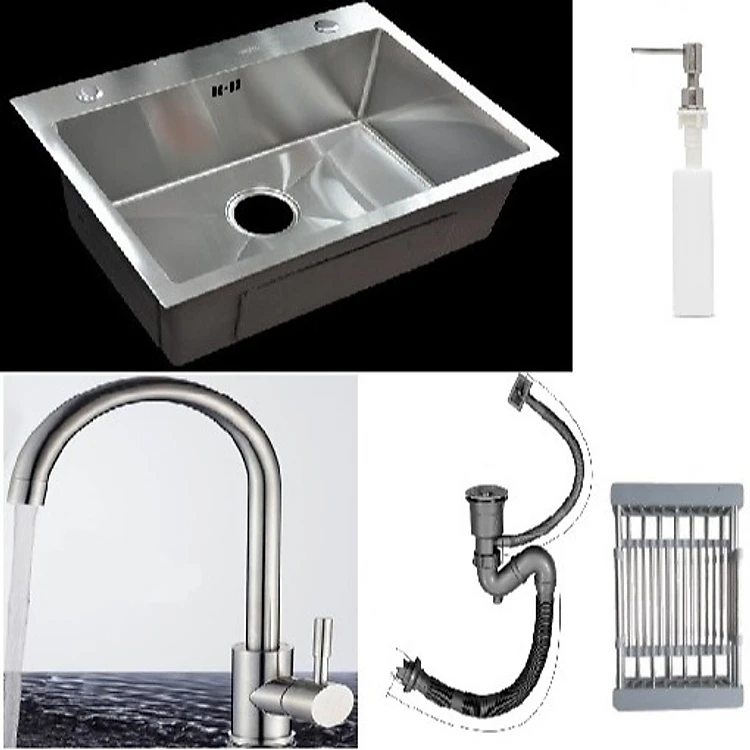 Combo chậu rửa chén bát inox 1 hố 6045, vòi rửa bát inox nóng lạnh cổ ngỗng, bình xà phòng, rá inox, bộ xiphong ống xả chậu