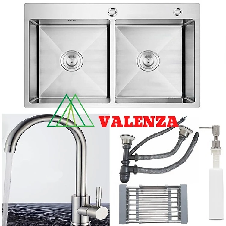 Combo chậu rửa chén bát inox hai hố cân 8245, vòi rửa bát cổ ngỗng nóng lạnh, bộ xả chậu, bình xà phòng, rá inox gác chậu