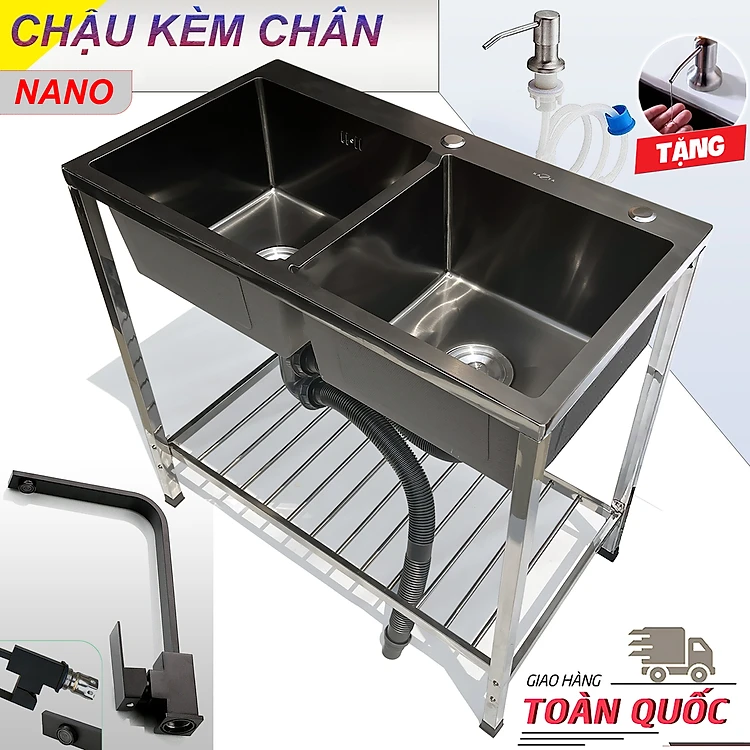 COMBO Chậu Rửa Chén Bát Inox Phủ Nano 2 Hộc KAZTA Có Kệ Chân Kèm Vòi Xoay 360 - Dài 82cm Rộng 45cm Cao 81cm, đầy đủ xi phông