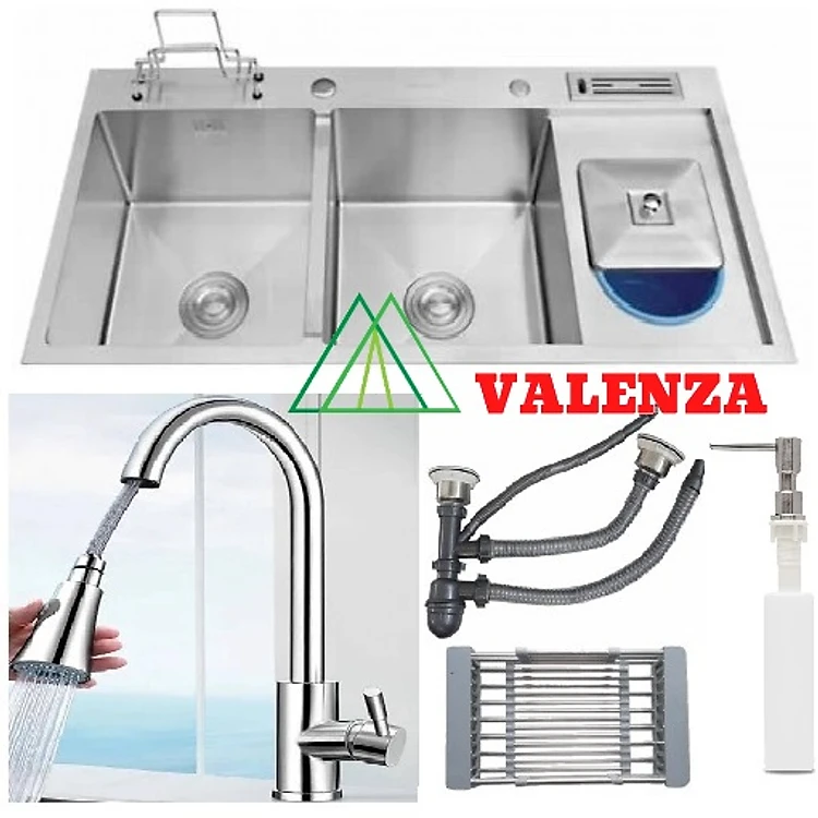 Combo chậu rửa chén bát inox sus304 10048 Valenza có hộc cài dao thớt + vòi rửa bát nóng lạnh đầu rút 01 inox sus304, rá inox đa năng, bình xà phòng