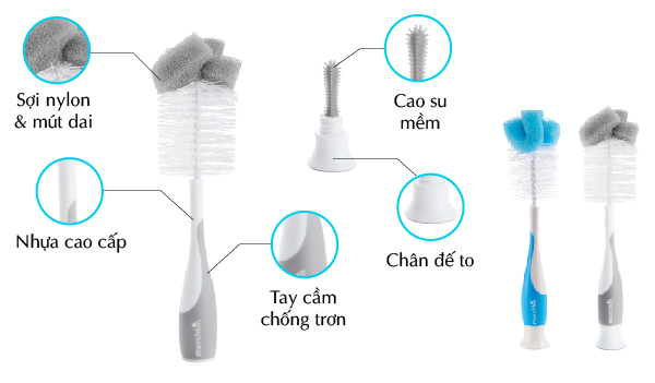 - Thân cọ bình sữa có mút Munchkin được làm từ nhựa cao cấp nên rất cứng cáp. Đầu chổi cọ được làm từ sợi nylon và mút dai, mềm mại và an toàn, không gây xước thân bình và các dụng cụ khi tiến hành vệ sinh.