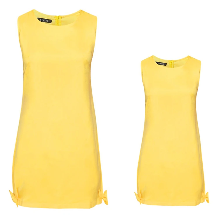 Combo Đầm Suông Mẹ Bé CIRINO CB_DAMCHIFFON_V_S4 - Vàng được may từ chất liệu vải voan dày dặn, mịn đẹp. Bề mặt vải có độ mềm mịn cao, ít bị nhăn, tạo phom đầm tốt. Phom đầm suông nhẹ, không kén dáng người. Thiết kế cổ tròn, sát nách với 2 chiếc nơ xinh xắn được gắn 2 bên chân đầm, tạo điểm nhấn đầy duyên dáng.