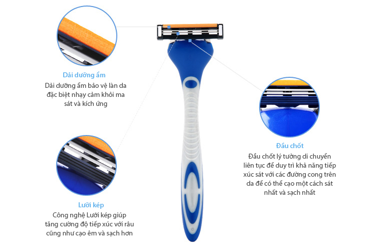 - Hệ thống cạo lưỡi kép giúp tăng tiếp xúc với râu giúp cạo êm và sạch hơn.