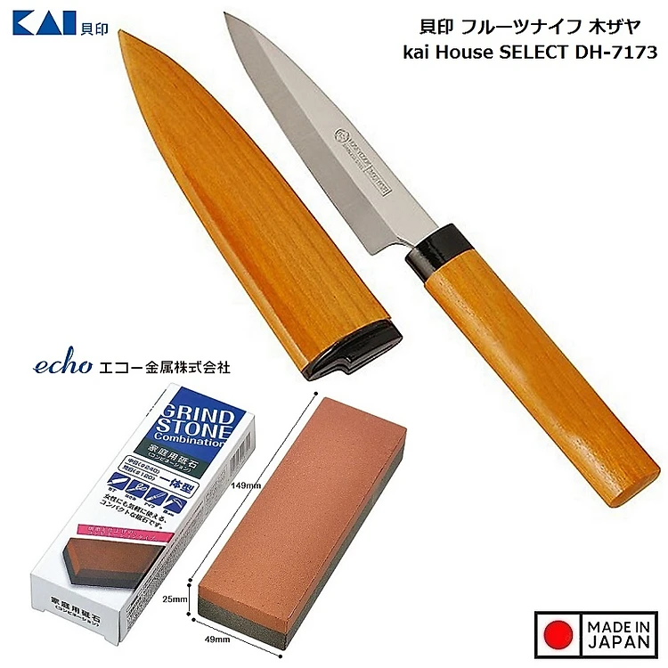 Combo Dao gọt hoa quả KAI có nắp đậy cán gỗ nội + Đá mài dao kéo nội địa Nhật Bản