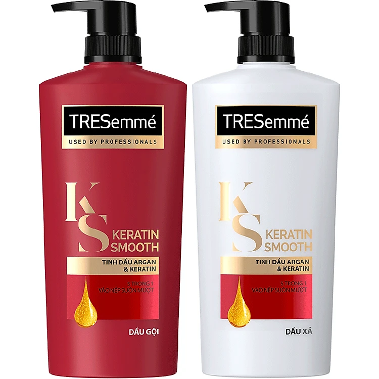 - Bộ gội xả TRESemmé Keratin dành cho tóc khô xơ, không vào nếp. Với công thức được bổ sung thêm tinh dầu Argan từ vùng Morocco và keratin, giúp thấm sâu bổ sung keratin, mang lại 5 hiệu quả sau một lần sử dụng: Tóc vào nếp bóng mượt mềm mại giảm xơ gỡ rối. Đặc biệt, sản phẩm còn thích hợp với cả tóc nhuộm.